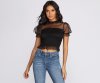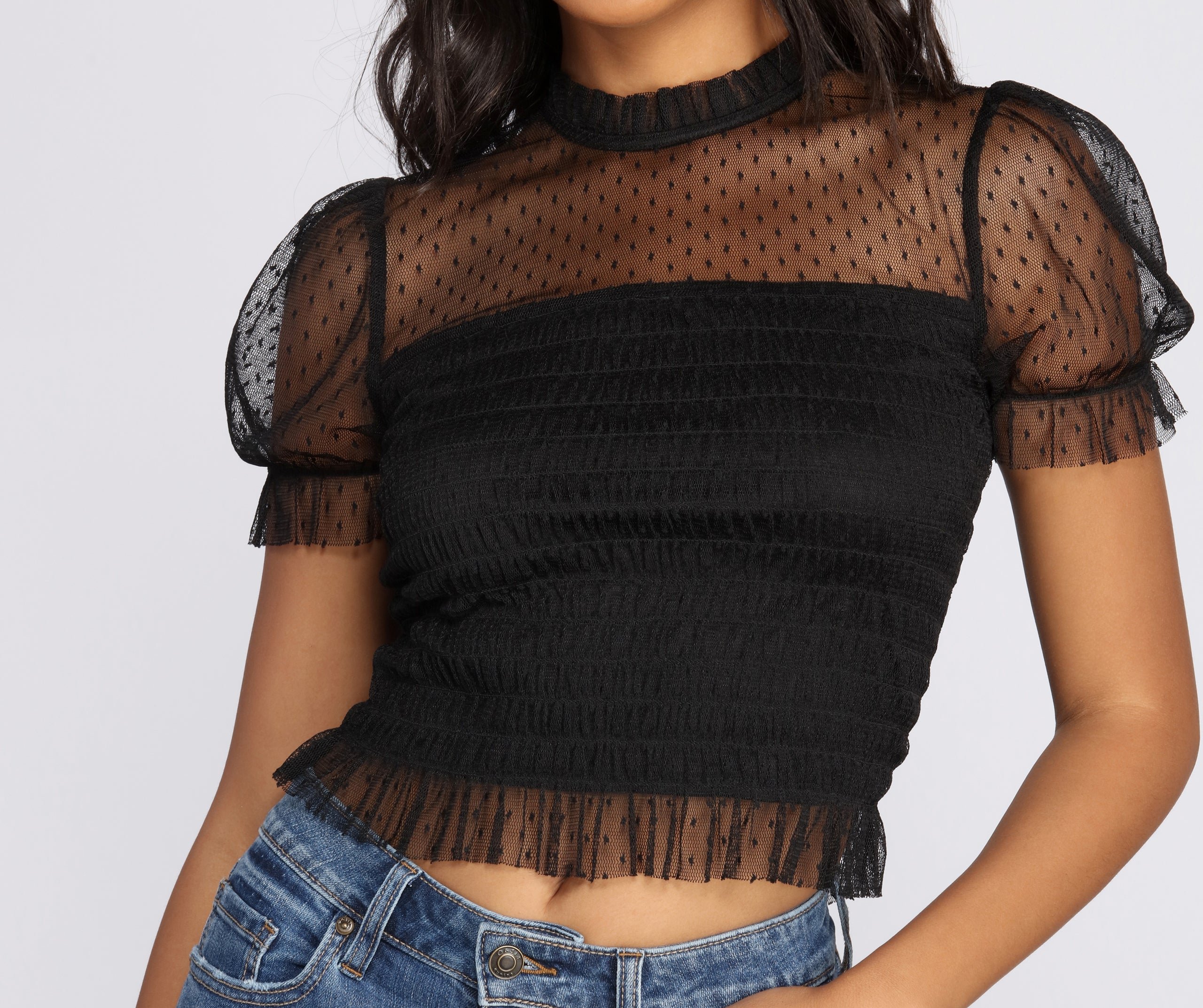 Get all classed up with this pretty little piece! It has a mock neck paired with short, balloon sleeves and a slim, smocked bodice. The garment is composed of a sheer mesh that features a small polka dot pattern that includes a keyhole back, and partial lining. Blouse offers a form hugging fit with minimal stretch.
