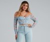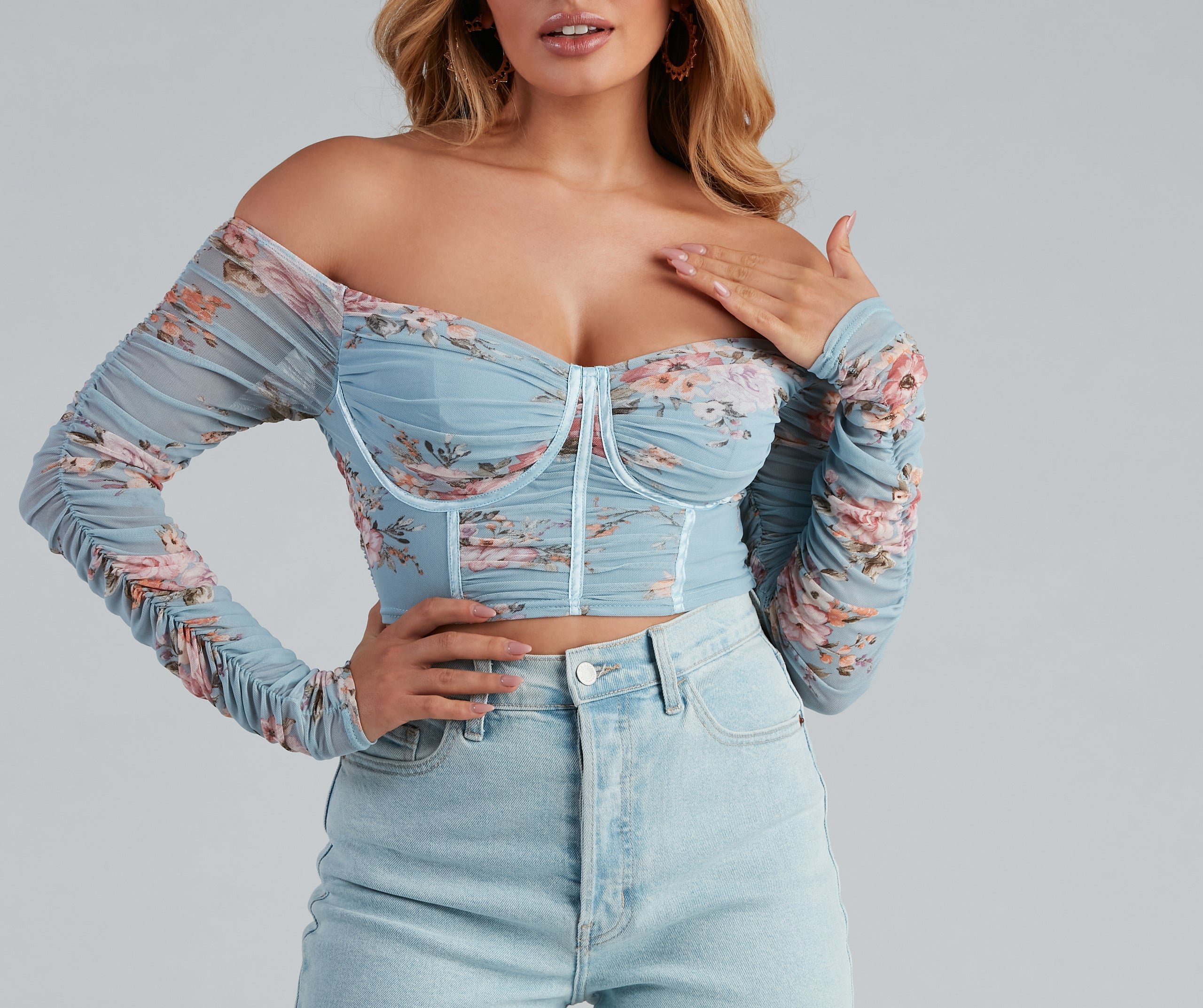 If you're all for the florals, this mesh satin trim bustier is for you! It features an off-the-shoulder neckline with ruched long sleeves, a built-in padded bust, and satin trim detail along the cropped hem. Complete the look in trendy