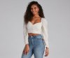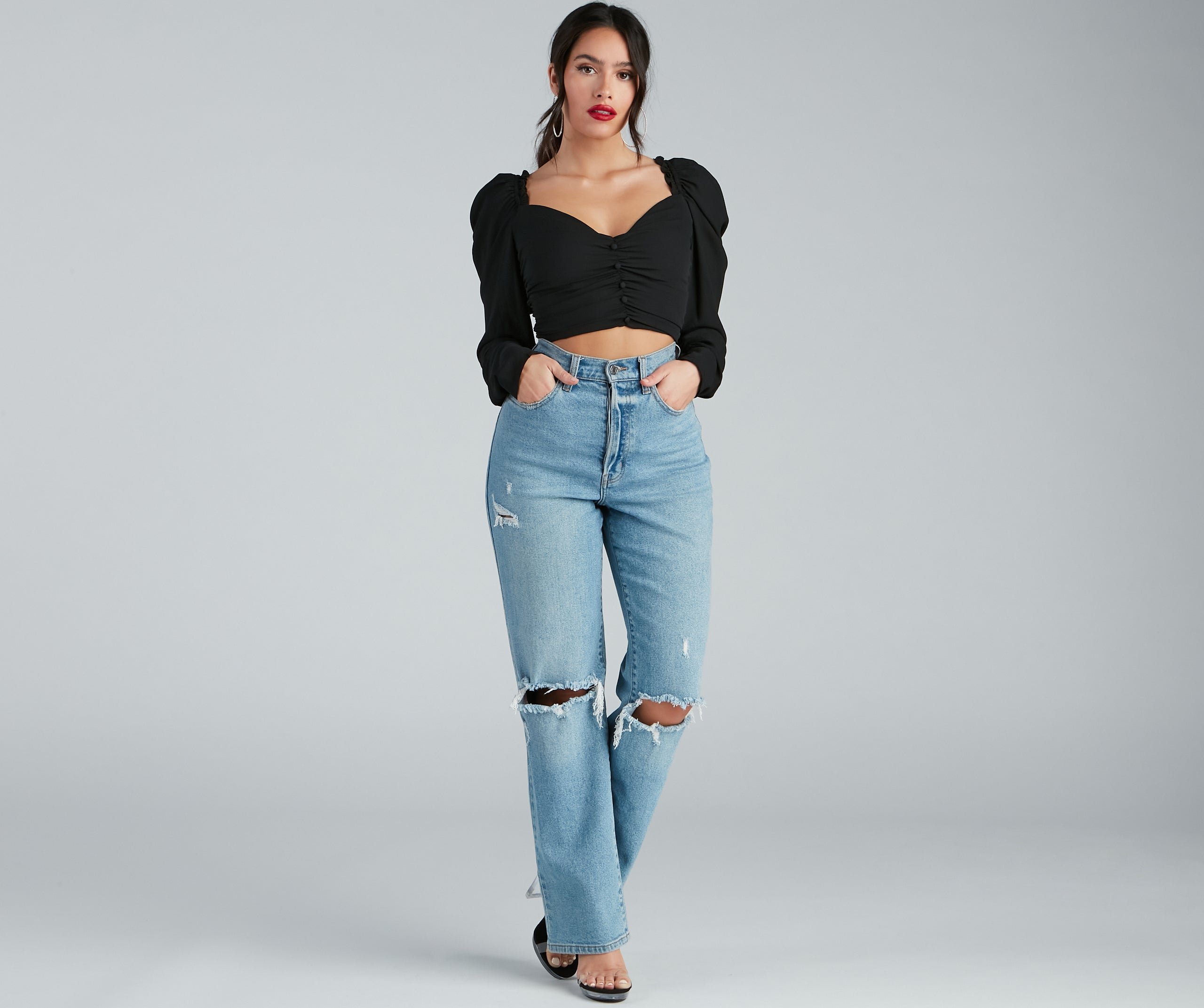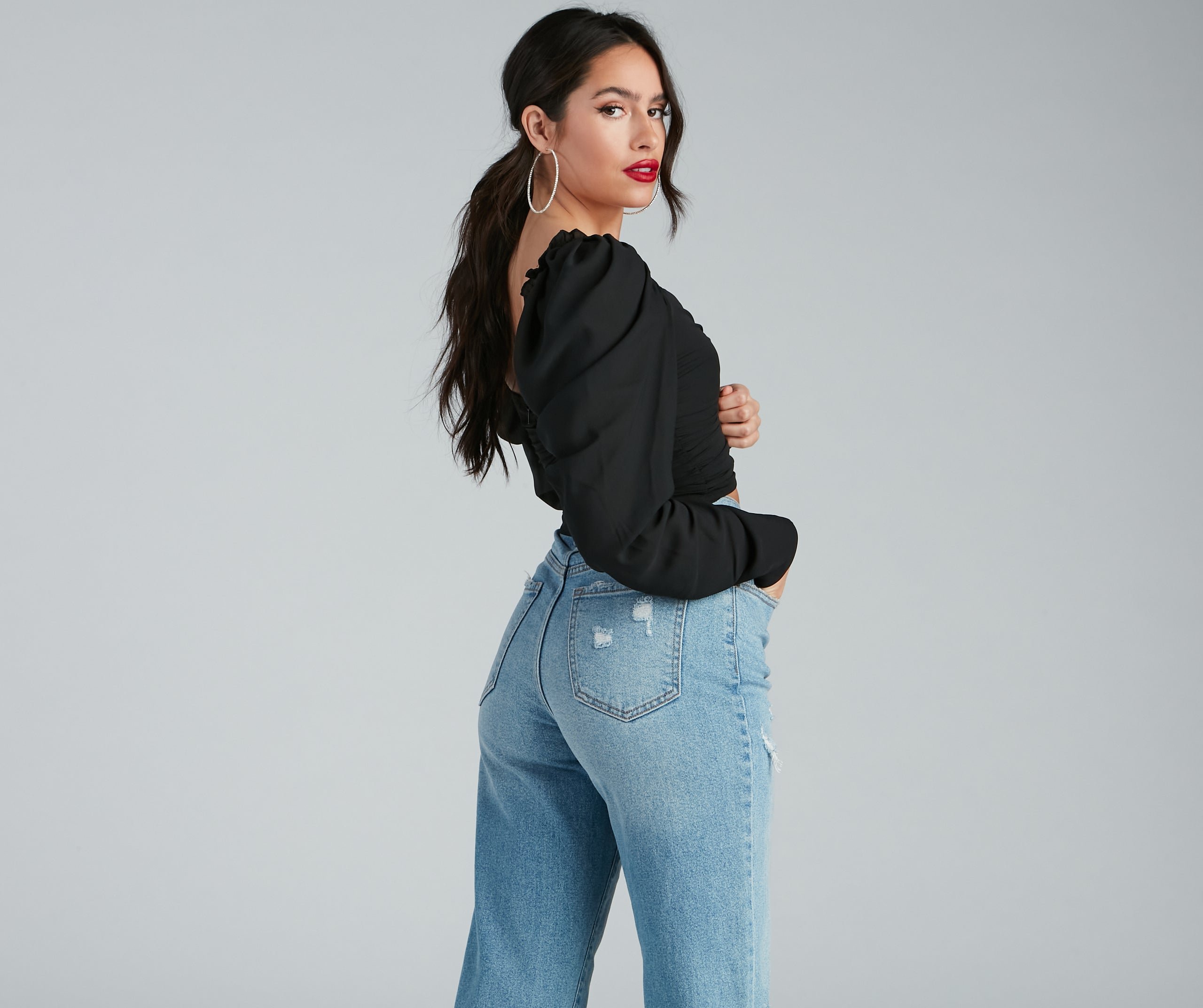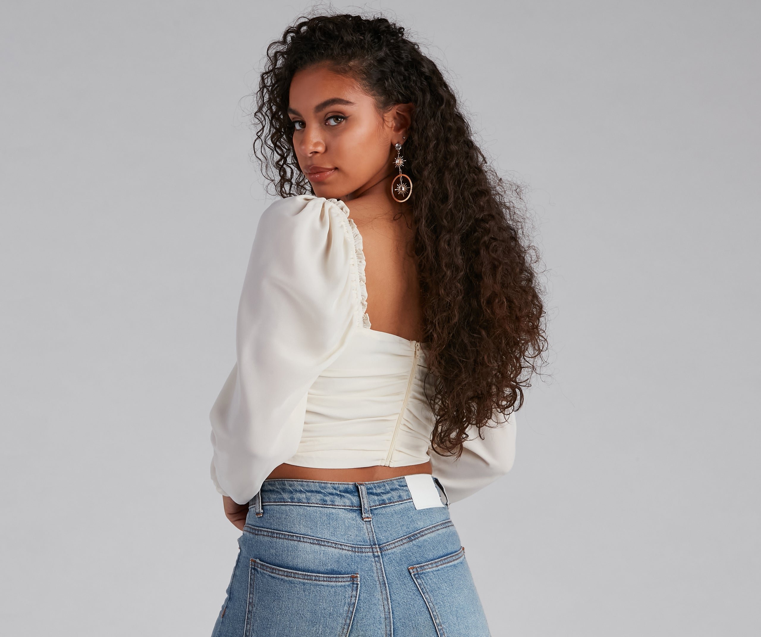 Have a shot at romance? This chiffon top is perfect for a wintertime fling! It features ruched, puff long sleeves, a v-neckline, button front accents on a ruched seam, a cropped hem, and zipper closure. Composed of a chiffon-lined woven fabric with no stretch. Style with high-rise