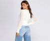 This gorgeous blouse can be taken from day to night! It features long sheer sleeves with a ruffle trim and triple buttons to cuff, a V neckline leading to a button down front, a flattering ruched waist with a partial stretchy smocked back, and a cropped, ruffle hem. The blouse offers a form-fitting style.