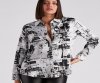 Get the daily scoop on this latest trend! Add this newsworthy satin top to your weekly rotation. It features long sleeves with button cuffs, a collar neckline, front button-down closures, and a flowy hem with side slit accents on newspaper print satin fabric. Complete the look in sleek