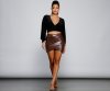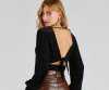 You'll be feelin' chic and stylish in this must-have crop top. It features long sheer blouson sleeves, a deep V-neckline with a wrap-front design, an open back with a tie closure, and a cropped, fitted silhouette. The sheer knit fabric has a front lining and an all-over flocked velvet leopard print pattern.?Style this top with a