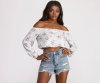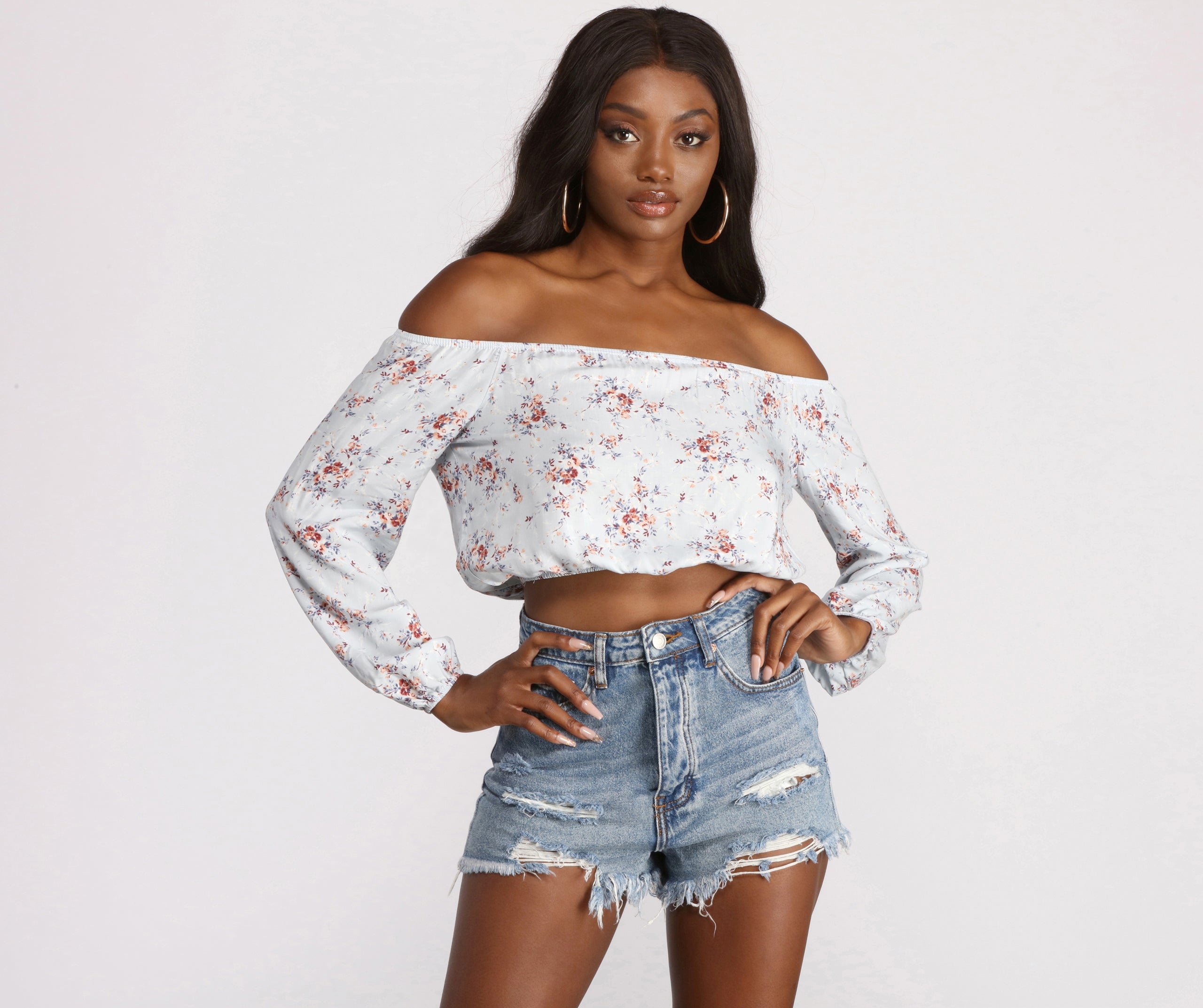 Bring on the charm in a floral top. This season must-have features an off the shoulder neckline, an all-over floral print, long sleeves, and a cropped hem.? The top is composed of a lightweight woven fabric that offers a relaxed fit. Complete your outfit with?