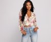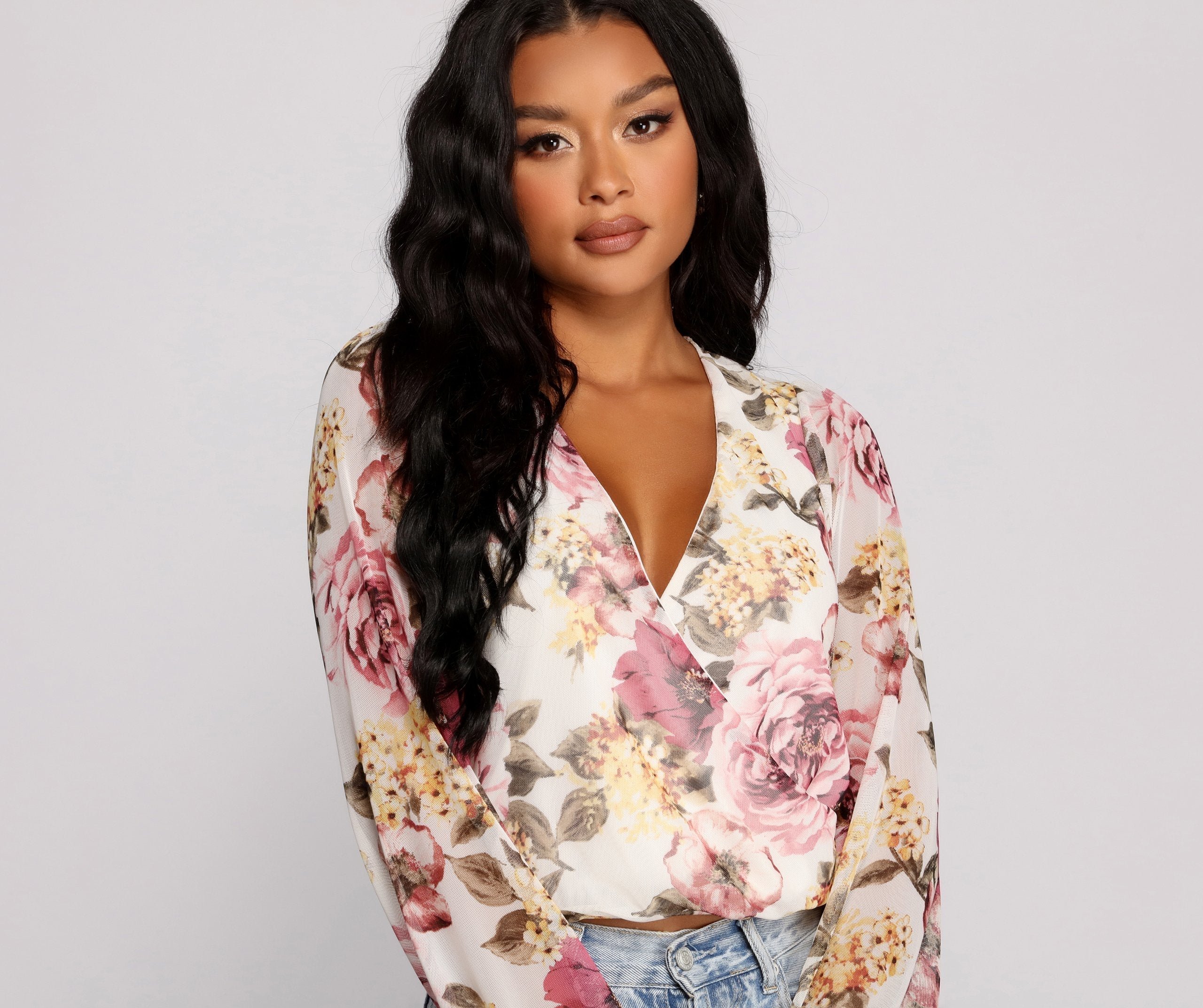 Keep it sweet in a floral top this season that brings the charm. The top features a plunging surplice neckline, flowy long sleeves, and a gorgeous floral print. Complete your look with