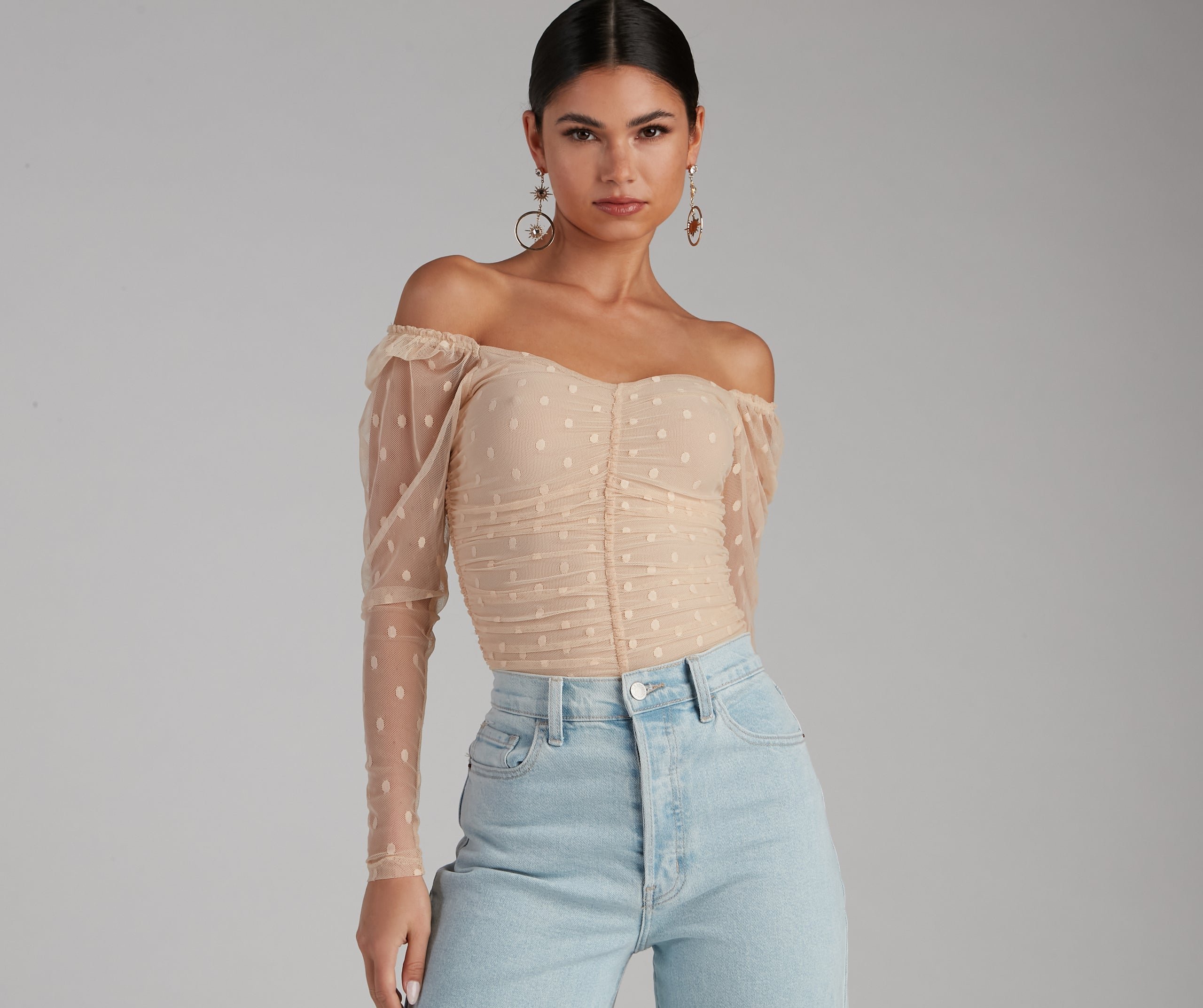 Your look will be on point when you step out in this pretty polka dot bodysuit! It features a sweetheart neckline, long fitted sheer sleeves with trendy puff shoulders, and a lined fitted bodice with ruched detailing. Dress it up with