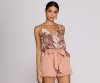 Boho charm meets warm-weather ease in this delicate chiffon crop. Top features adjustable spaghetti straps, a surplice bodice, and an elasticized hem. Top is semi-sheer and made from a lightweight woven material with little to no stretch.