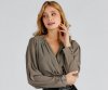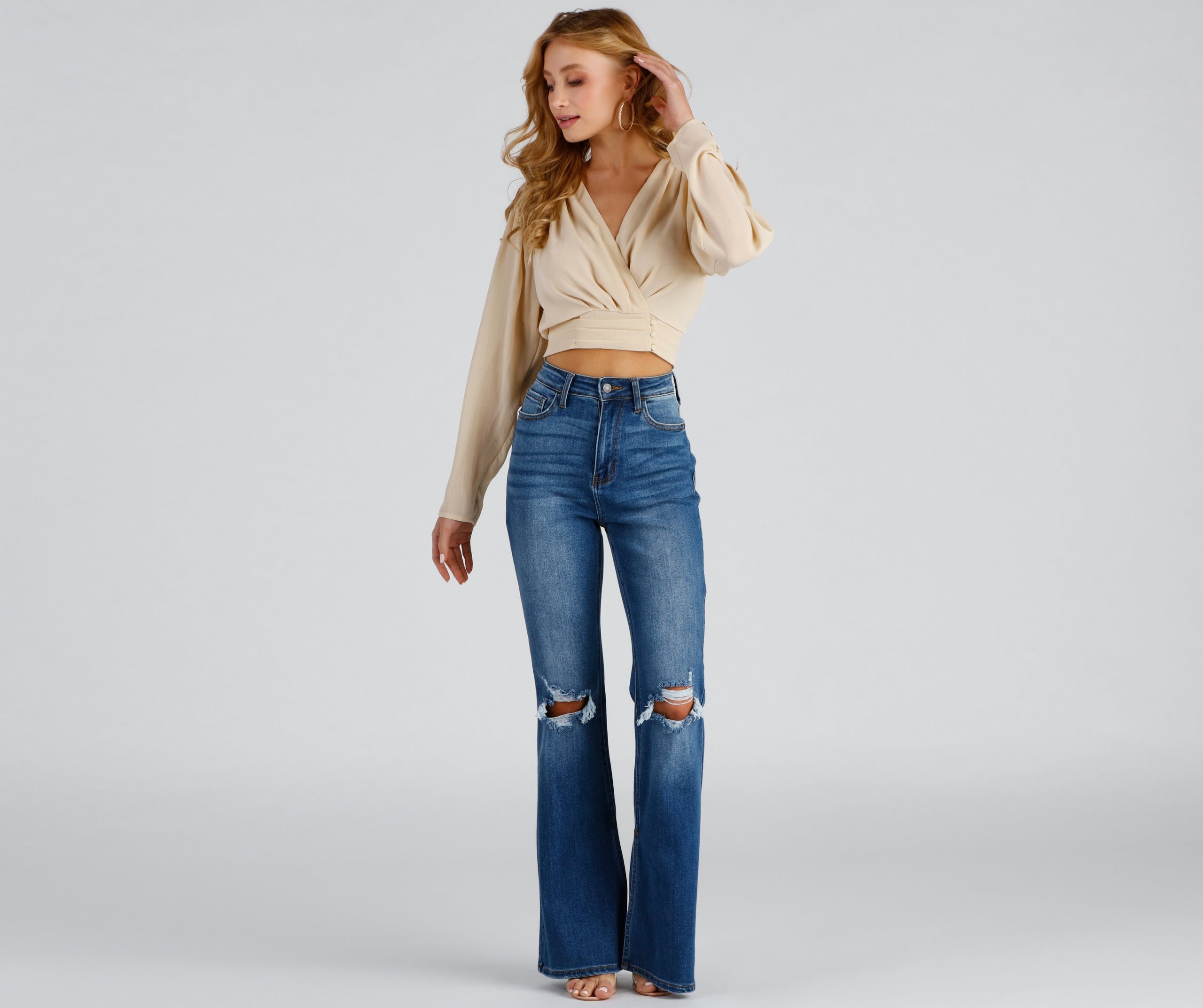 With this chiffon top, you'll be playing favorites with it all week! It features pleated long sleeves with buttons, a surplice V-neckline, and a cropped hem with front button closures and a smocked back detail. The lined chiffon woven fabric offers no stretch. Complete your look with a midi