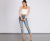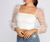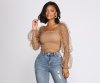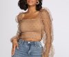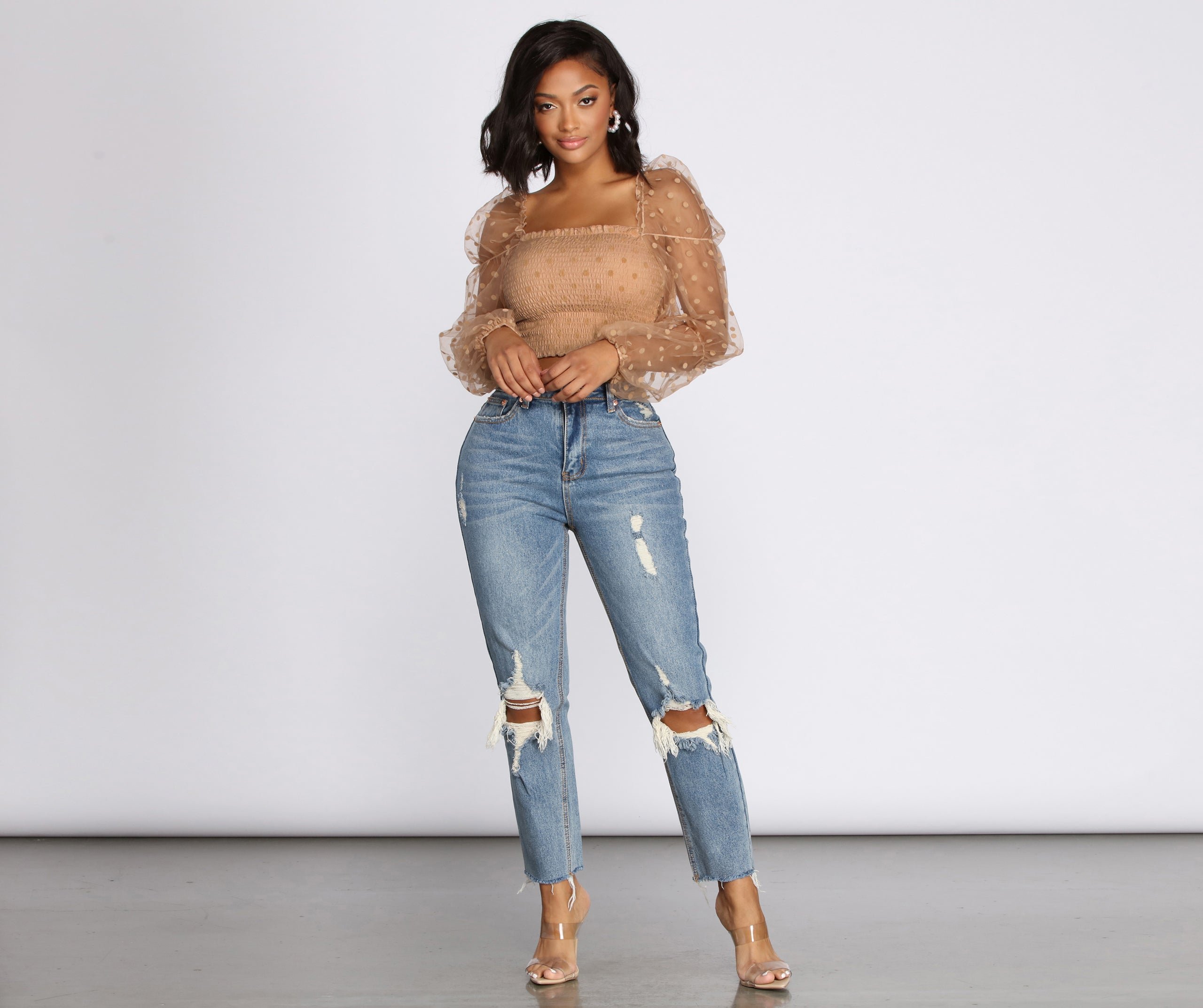 You'll look as pretty as ever in this polka dot crop! The top features sheer organza sleeves with elastic banded hems and a stretchy smocked top with a square neck and a sheer back. Garment offers plenty of stretch and a form hugging fit.