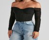 Have a major ruched moment and elevate your trendy look with this cropped bustier. It features an off-the-shoulder, sweetheart neckline, ruched long sleeves and bust, padded cups, and a classic bustier-style bodice along the cropped hem. Style with a?
