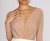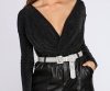Put the spotlight on you girl as you dazzle the night away in this addicting bodysuit! This surplice beauty features a plunging wrap V neckline, long sleeves, and all over twinkling glitter details that will make you radiate from any angle! Includes thong bottom with snap button closure. Bodysuit is composed of a metallic knit fabric that offers a relaxed fit with plenty of stretch.?