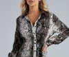This snake pattern satin tunic will make a slithering good addition to your wardrobe! It features long sleeves with button cuffs, a collared neckline, a front button-up, a smocked waist, and a scoop hem. Perfect for styling with a panama