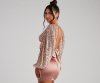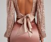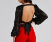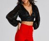 Step up the glam with this gorgeous embroidered crop top! It features a low V-neckline, long bishop sleeves, a horizontal back bar strap, an open back design with a satin lower tie detail, and a cropped, form-hugging fit. Showcase a stunning sparkle with the all-over sequin embroidery. Style this top with a