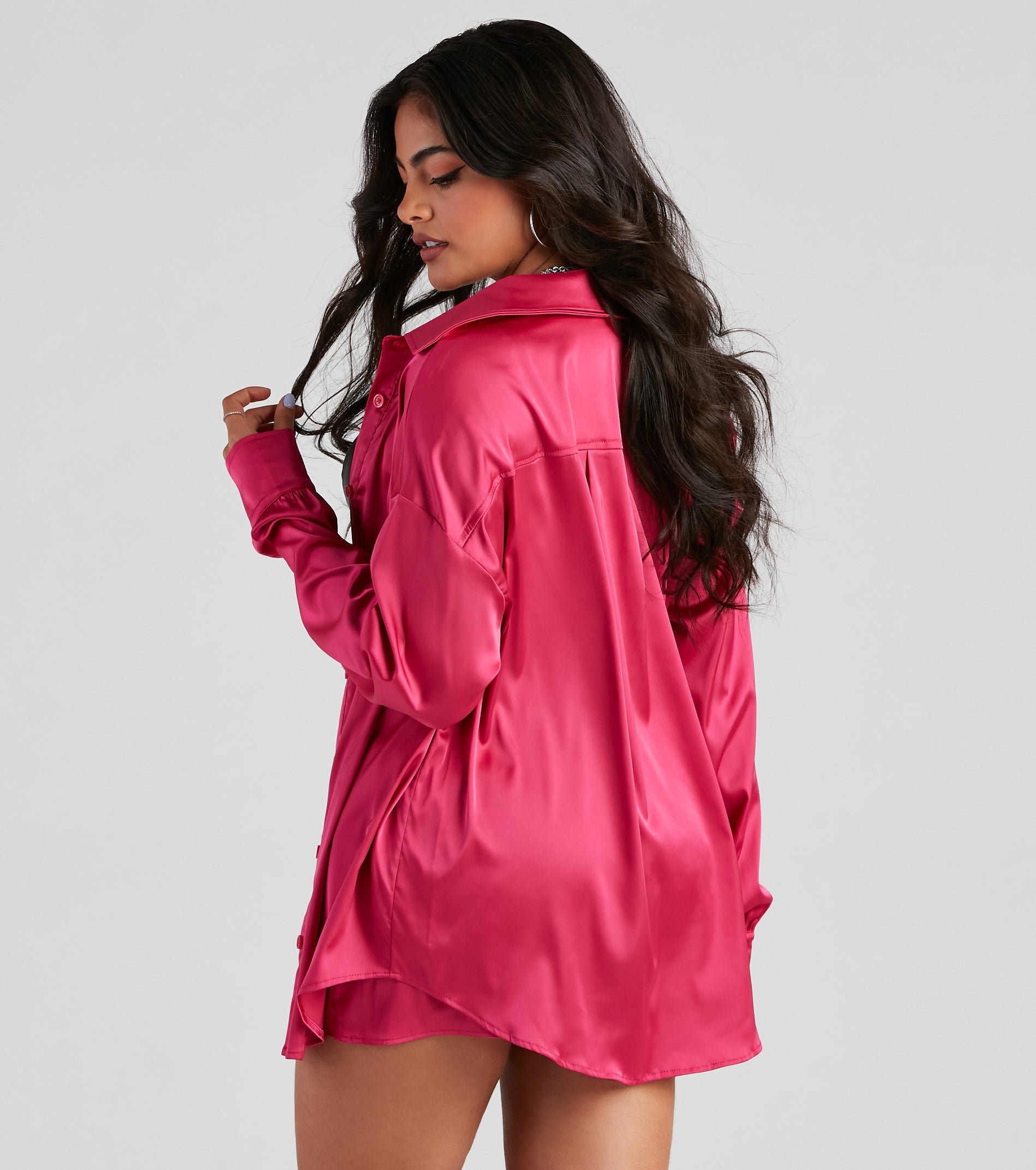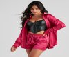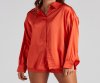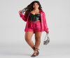 Keep it stylishly sleek with a button-down top that brings the luxe. The top features a collared neckline, a button-down front closure, and long sleeves with a single-button cuff. The top is composed of a satin fabric that offers a relaxed fit with minimal stretch. Complete the look with the matching shorts.?