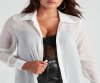 or a lacey bralette! It features long sleeves with button cuffs, a collared neckline, high side slits along a flowy, round hem. Composed of sheer gauze woven fabric with no stretch.
