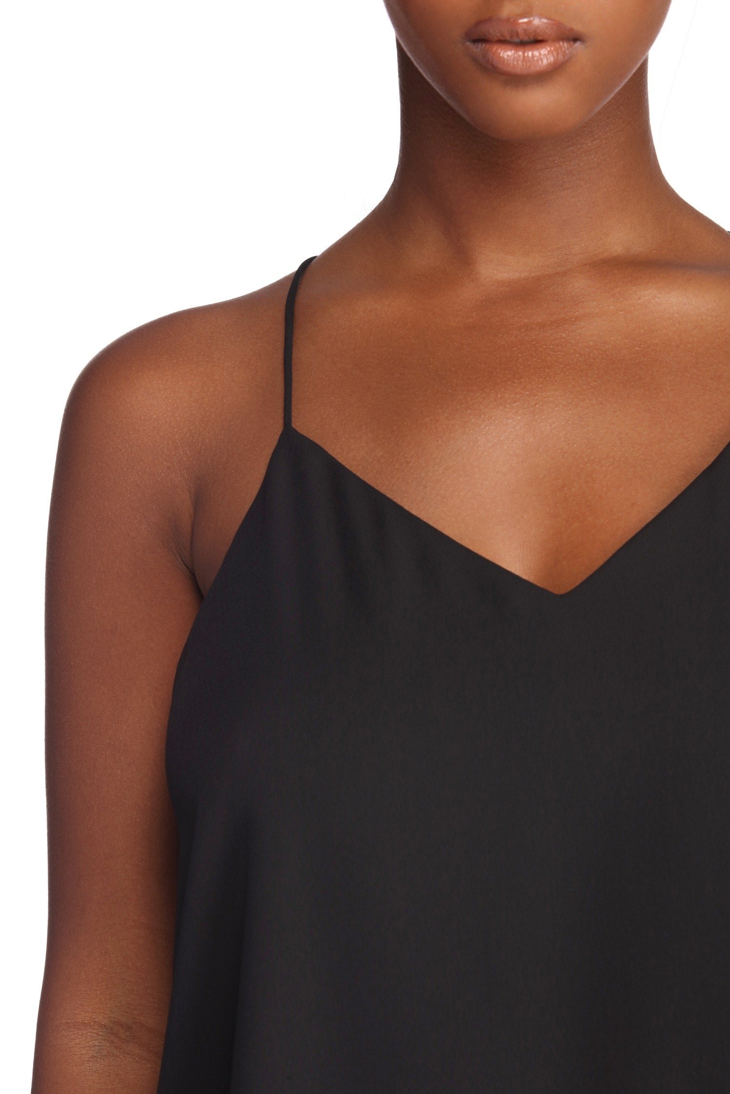 You'll be looking sweet and chic in this essential cami! It features a sleeveless bodice, spaghetti straps that lead to a high back, a V neckline, and a flowy, relaxed fit. The top is composed of a chiffon fabric with a chiffon lining and has no stretch.