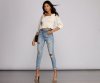 Sweet and smocked, this cropped top is perf for a nice day outing. It features a square neckline, three quarter length puff sleeves with smocked cuffs and eyelet detailing along the shoulders, a stretchy smocked bodice, and a ruffled cropped hem. The top is composed of a lightweight woven fabric.