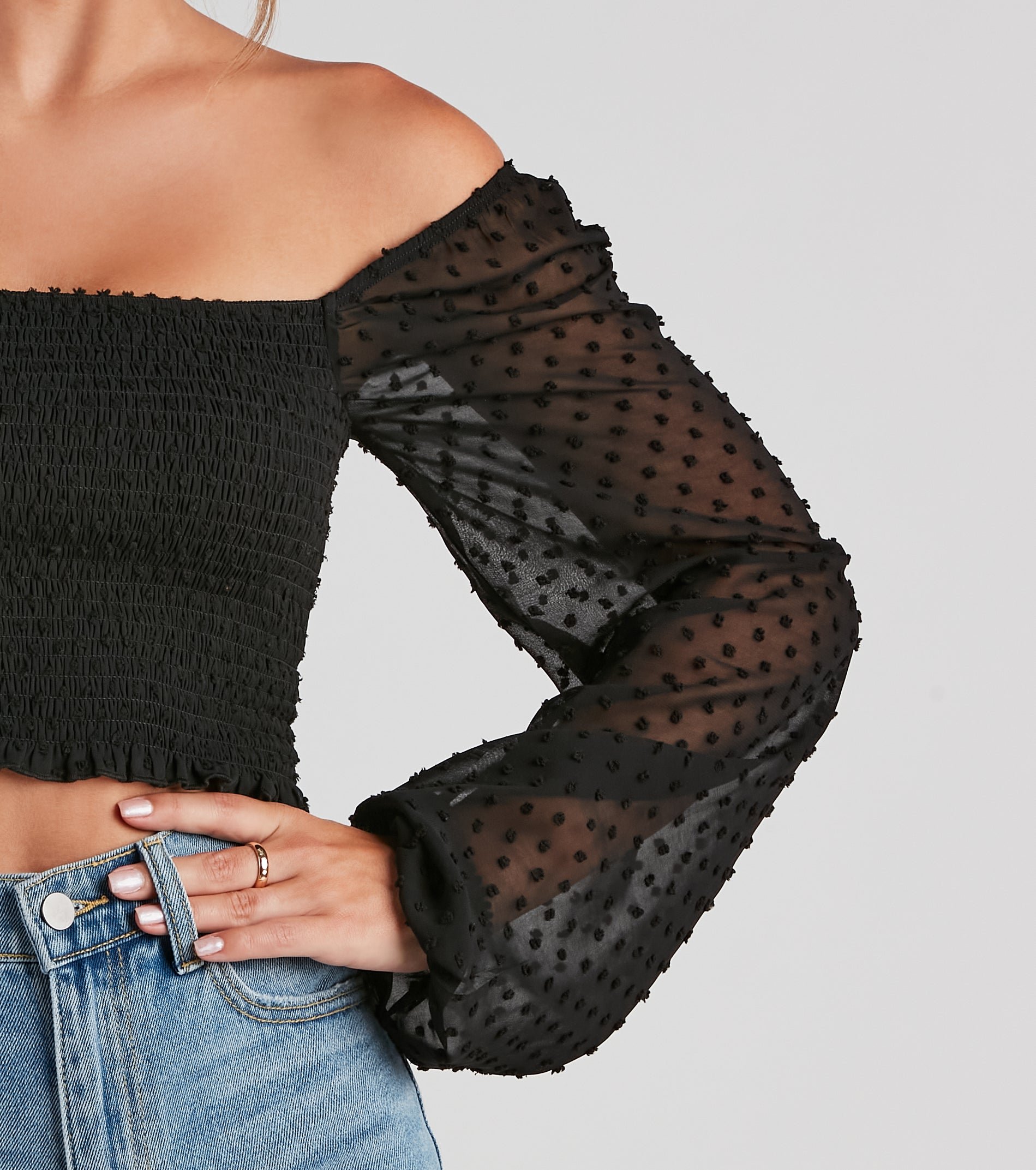 Stay on trend with a cute top that is perf for nailing those brunch outings with the squad! The top features a pretty swiss dot pattern, a square neckline, a smocked bodice, sheer long bishop sleeves, and a cropped hem. The top offers a form-hugging fit with a moderate stretch. Complete look with mom jeans and