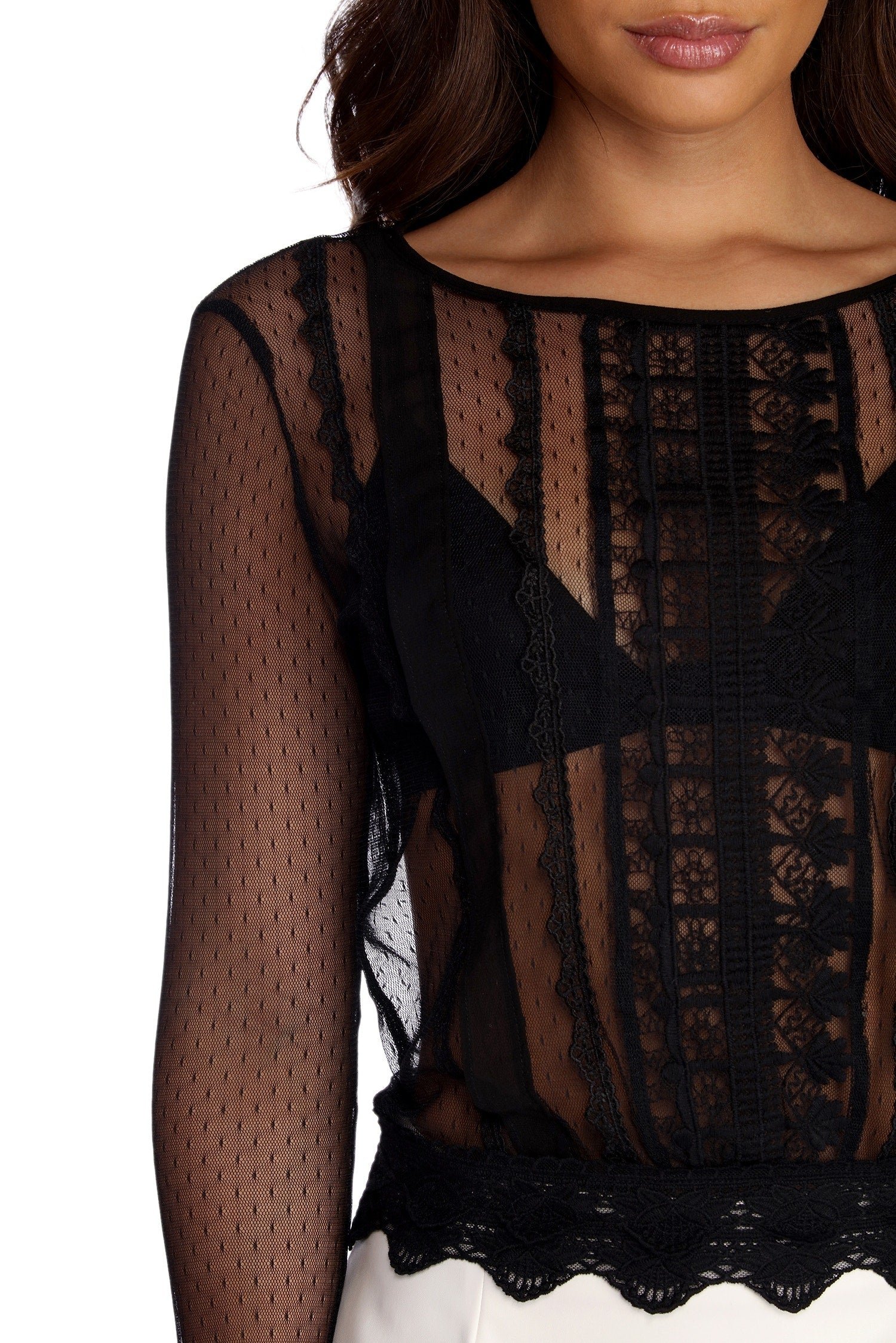 Don't be afraid of a little exposure! This cute blouse has a boat neckline paired with fitted, long sleeves. The garment is composed of a sheer mesh fabric that features scalloped crochet details and trim.