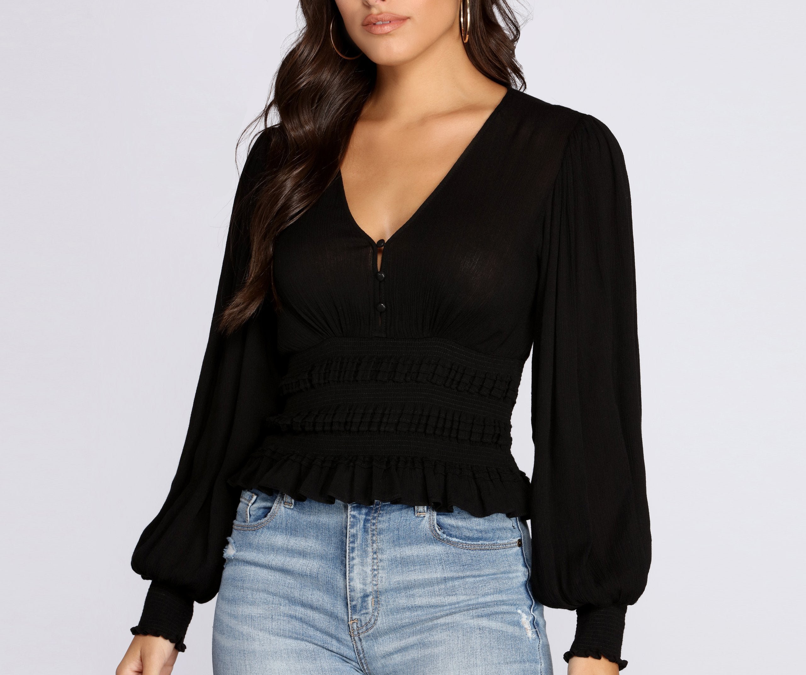 Breezy and effortlessly chic, this blouse is made for easy, warm-weather getaways. Top features long, billowy sleeves with smocked cuffs, a plunging V leading to a three-button closure, and a smocked and ruffle-trimmed elasticized waist. Blouse is made from a gauzy, pure rayon with little to no stretch.
