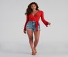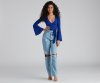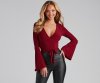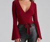 Wrap yourself in a chic top that elevates your style. The top features a plunging wrap V-neckline, long bell sleeves, and a mid-length hem with a tie accent. The top is composed of a smooth knit fabric that offers a form-hugging fit with a moderate stretch. Complete look with