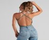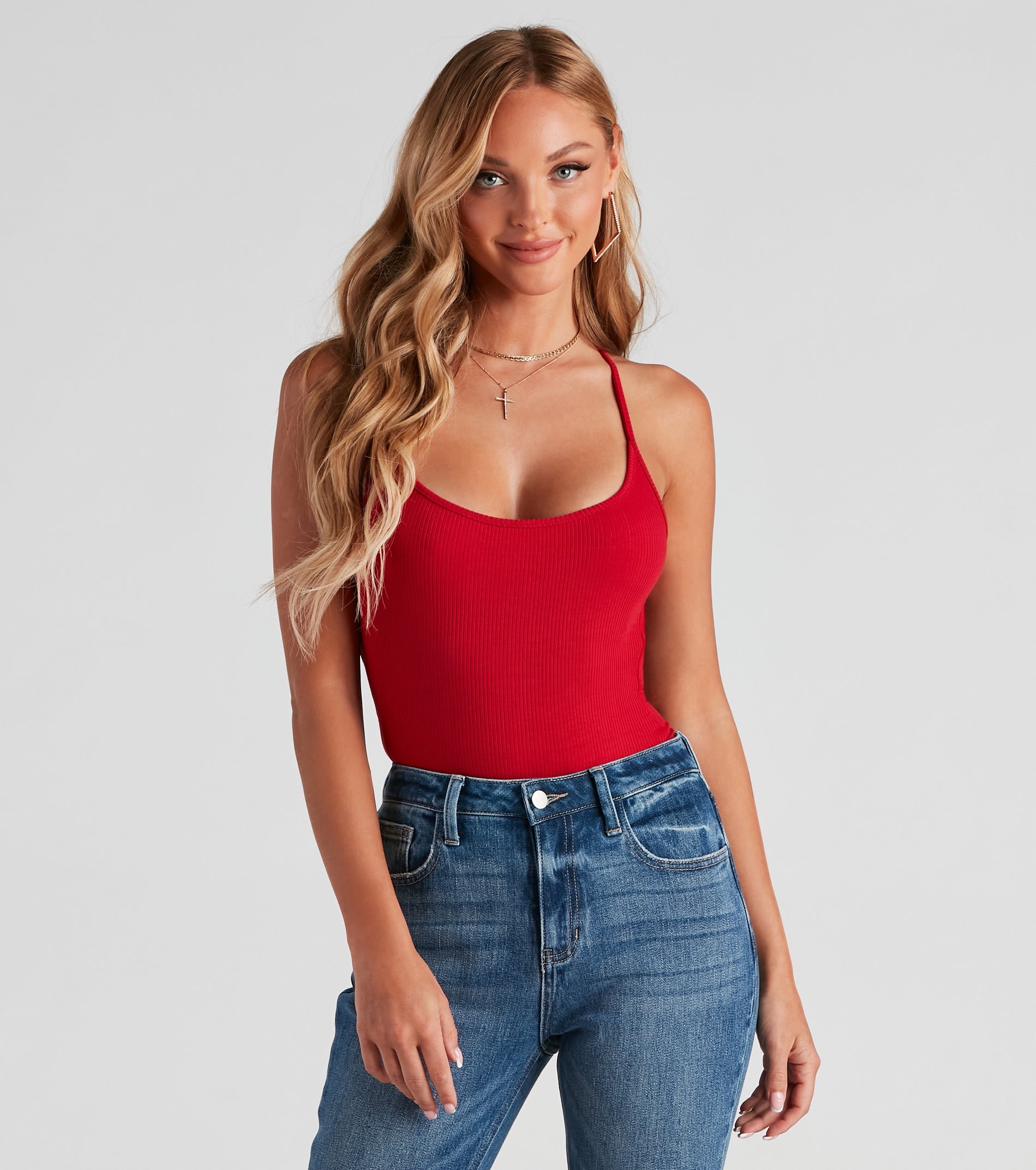 Style up this basic knit bodysuit for a perf cute and casual look. It features a sleeveless scoop neckline, spaghetti straps that lead to an open back with a trendy cross-back strap design, a fitted silhouette, and a thong bottom. The lightweight ribbed knit fabric offers plenty of stretch. Pair this bodysuit with high-rise vintage-inspired jeans and