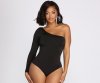 Get a chic vibe in this one shoulder bodysuit! It features a single long fitted sleeve paired with a thong bottom to avoid unflattering lines and dual snap-button closures for a secure fit. Complete the outfit with