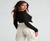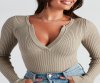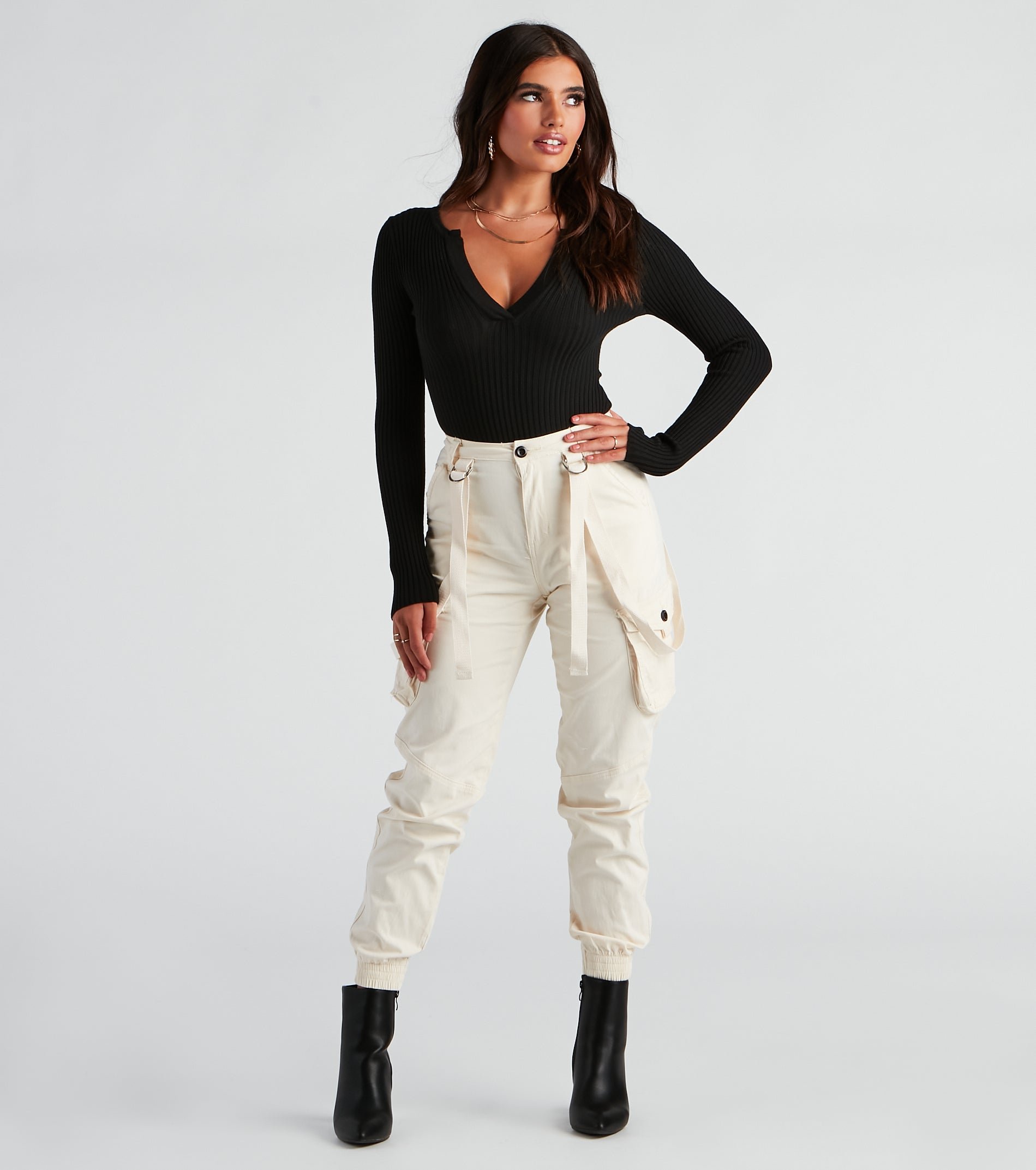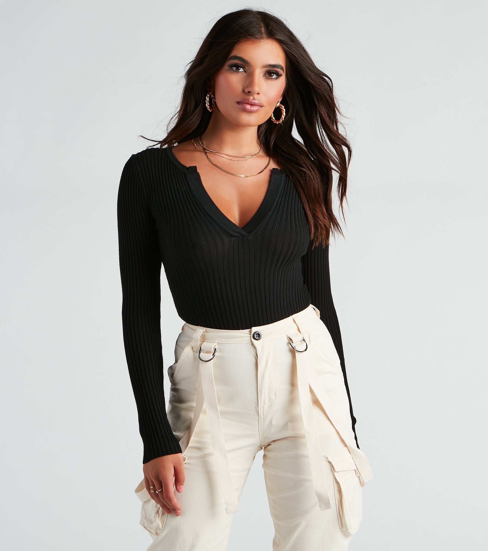 You'll always be confident with this stylish essential bodysuit! It features long fitted sleeves, a V-neck with trim, and a thong bottom with dual snap button closures. The bodysuit is composed of a sweater rib-knit fabric that offers plenty of stretch. Complete the look in