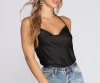 Start your outfit off right with this chic cowl neck satin bodysuit! It features a sleeveless bodice, spaghetti straps that lead to an adjustable halter back, a trendy cowl neckline, and a thong bottom with snap button closures. The bodysuit is composed of a smooth satin-like fabric.
