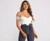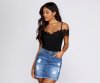 Crochet is in! So jump on the trend with this cute bodysuit! It has an off the shoulder neckline composed of a crochet border that doubles as short sleeves. It also features a V front and thin adjustable straps for the perfect fit. The base of the top is composed of a thin knit fabric that offers plenty of stretch and includes a full bottom with a snap button closure.