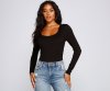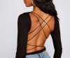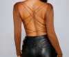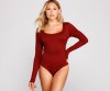 . The bodysuit features a square neckline, a strappy back design, long sleeves, and a thong bottom with a dual snap button closure. The bodysuit is composed of a brushed knit fabric that offers a form-hugging fit with a moderate stretch.