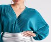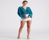 Flawless and sultry! Bring the allure in this surplice bodysuit featuring long balloon sleeves, a plunge V-neckline, and a faux wrap bodice, cheeky bottom with dual snap-button closures on pleated knit fabric. Complete the look in hot