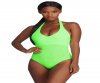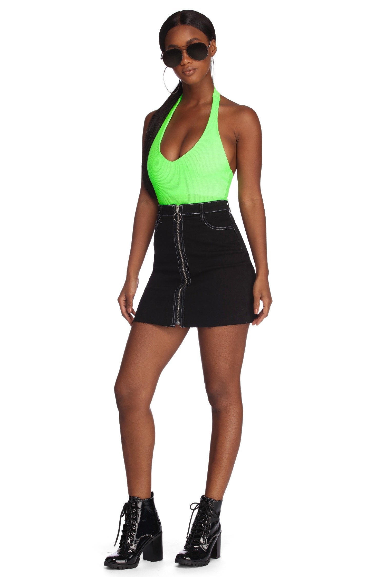This neon pink bodysuit is so glow-worthy! It features a sleeveless bodice, a halter V neckline with an elastic band at the neck, and a partially covered bottom with snap button closures. The bodysuit is composed of a ribbed knit fabric with plenty of stretch.