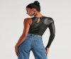 Turn up your stylish edge in this sleek and chic faux leather bodysuit featuring a one-shoulder crew neckline, a fitted long sleeve, a back keyhole with button closure, and a sultry waist cutout. Style with