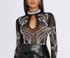 Stun on them this weekend girl! This sheer bodysuit is all about the details! Designed with a mock neckline, long sleeves, and a deep keyhole cut out at the center front. Bottom of the bodysuit is thong style with a double snap closure and back features a zipper closure. Composed of a mesh material that offers moderate stretch and is embellished with pears and rhinestones throughout, oh you fancy!