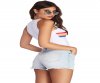 Get those summer vibes going with this bright bodysuit! It features a sleeveless bodice, tank-like shoulder straps, a U-neckline, a multi-colored stripe accent, and a partially covered bottom with snap button closures. The white bodysuit is composed of a knit fabric that offers a form-fitting style with moderate stretch.