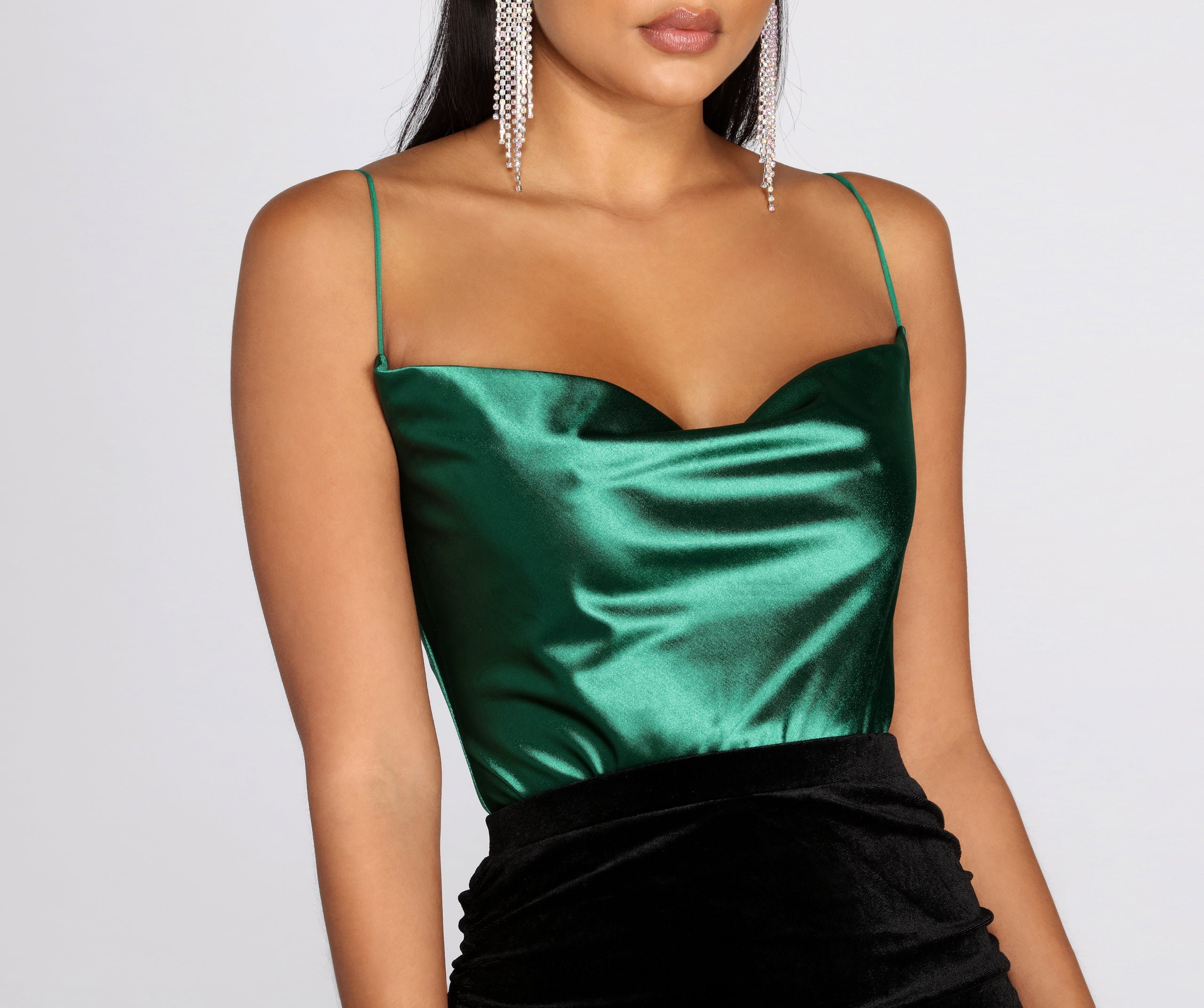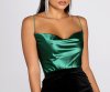 You're all about that satin trend this season! This bodysuit features a sleeveless bodice, bungee spaghetti straps, a cowl neck, a square back, and a thong bottom with dual snap button closures. The satin-like fabric offers an ample amount of stretch and a form-fit.