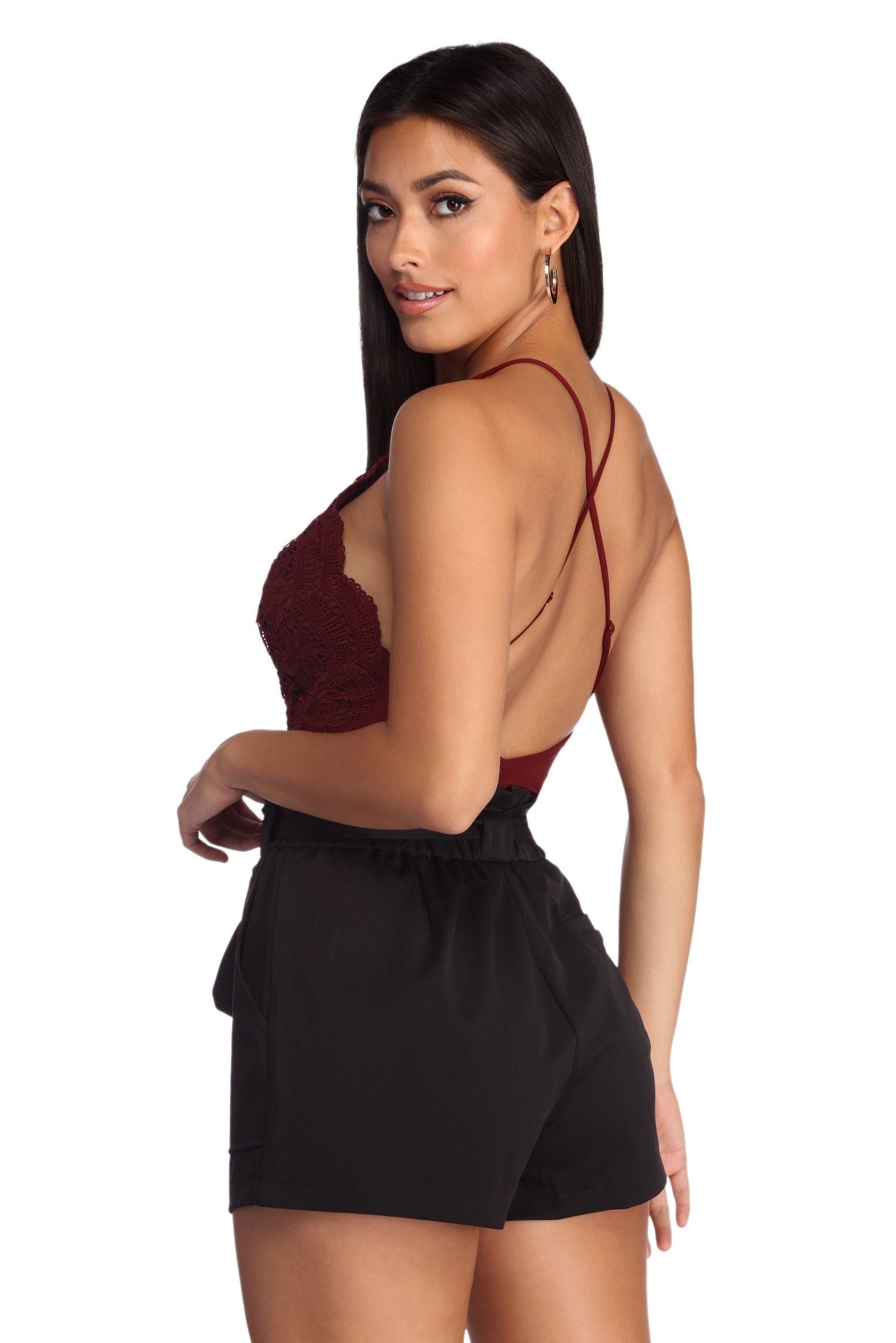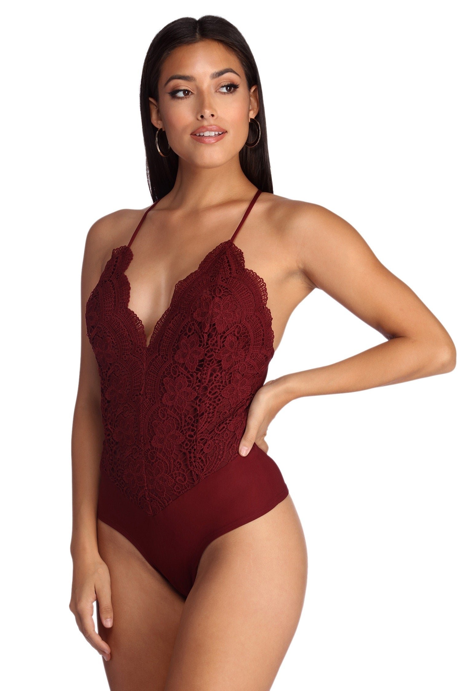 This scalloped lace bodysuit is perfect for the spring season! It features a sleeveless bodice, adjustable spaghetti straps that cross in the back, a low scoop back, a deep V scalloped neckline, and a thong bottom with snap button closures. The bodysuit is composed of a stretchy knit and floral lace fabric.