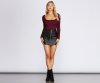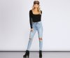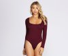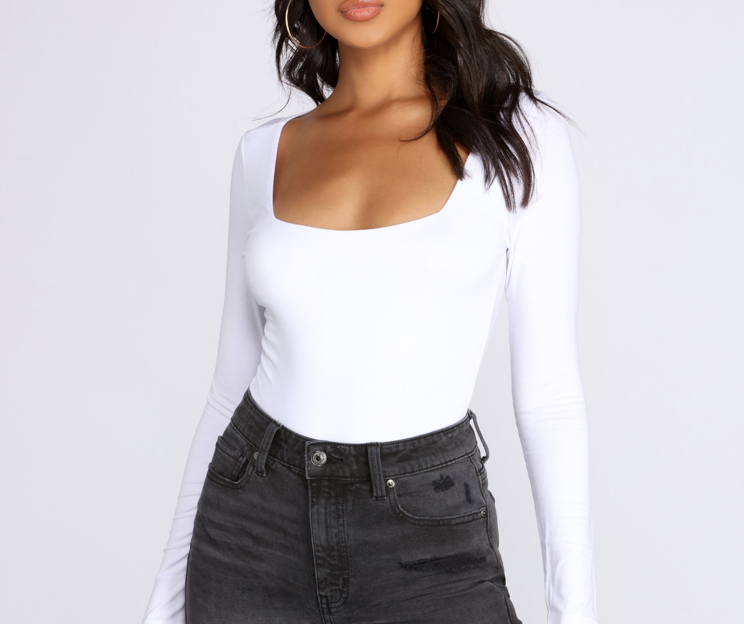 Your look will be simply trendy with this essential bodysuit. It features long fitted sleeves, a square neck, and a paritial coverage bottom with dual snap button closures. The bodysuit is composed of a stretchy knit fabric, offering a form hugging fit.