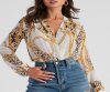 Unleash your wild side in this chiffon bodysuit perf for bringing the heat on girl's night! It features long peasant sleeves, a surplice v-neck, dual snap-button closure, a thong bottom, and a fierce leopard and chain-link print design. Complete the look in high-rise