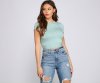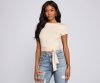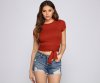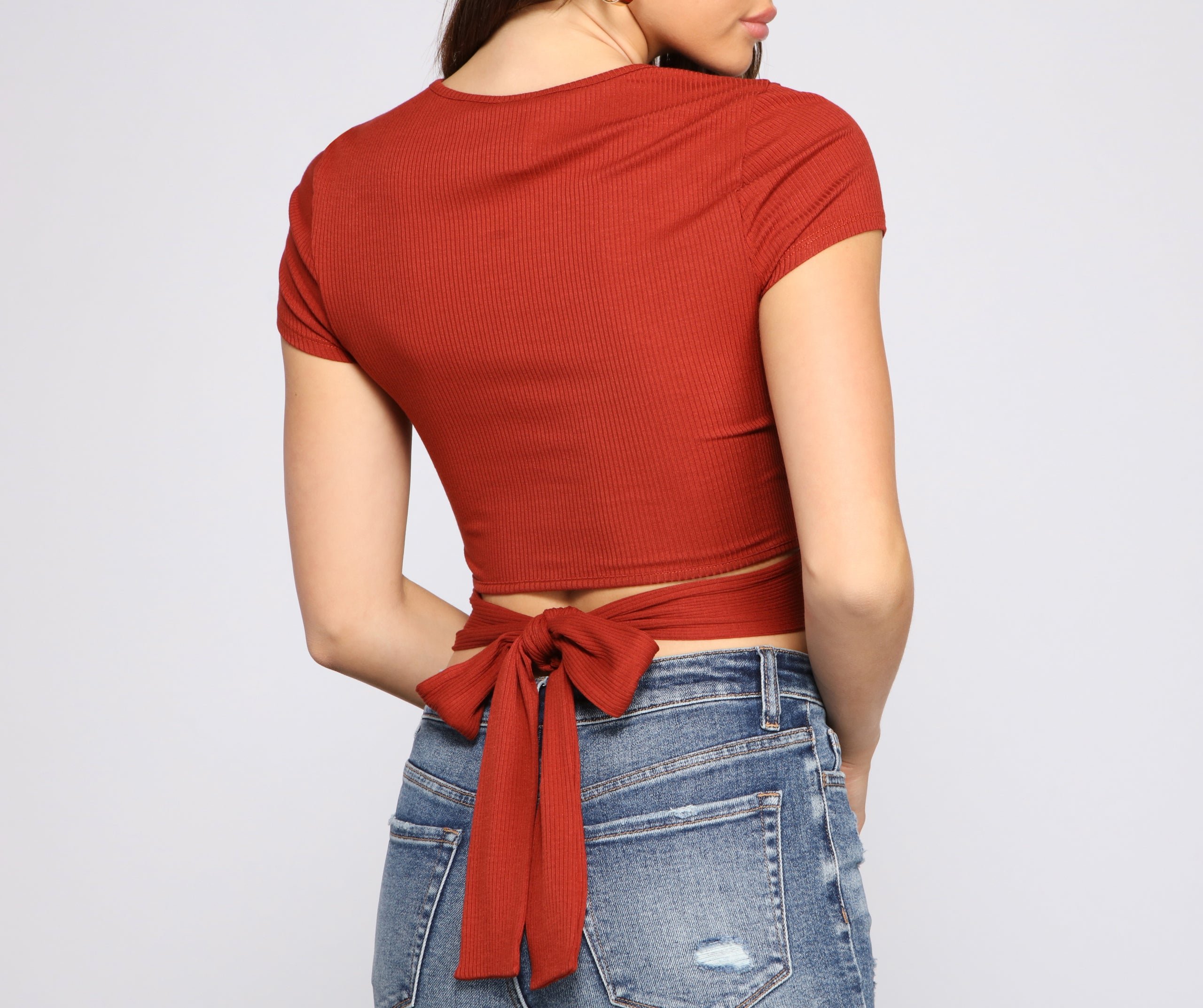 Channel a basic mood with a ribbed knit top that elevates the everyday! The top features a crew neckline, short sleeves, a wrap-around waist tie accent, and a cropped hem. The top is composed of a ribbed knit fabric that offers a form-hugging fit with a moderate stretch. Complete look with
