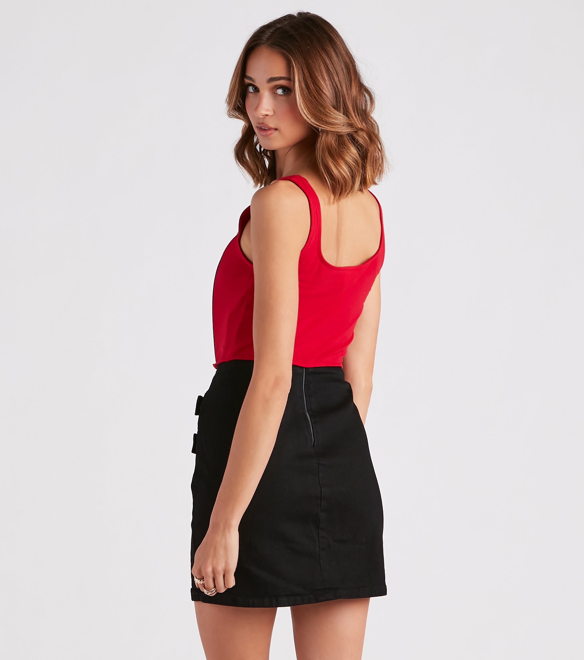 - Sleeveless square neck