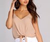 Keep it breezy in this flowy crop cami. This top features a V neckline, spaghetti straps that lead to a square back, and a tie front detail. This cropped cami top has a relaxed fit and is made of a knit material that has little stretch. Pair with your favorite high waisted pants or shorts!