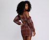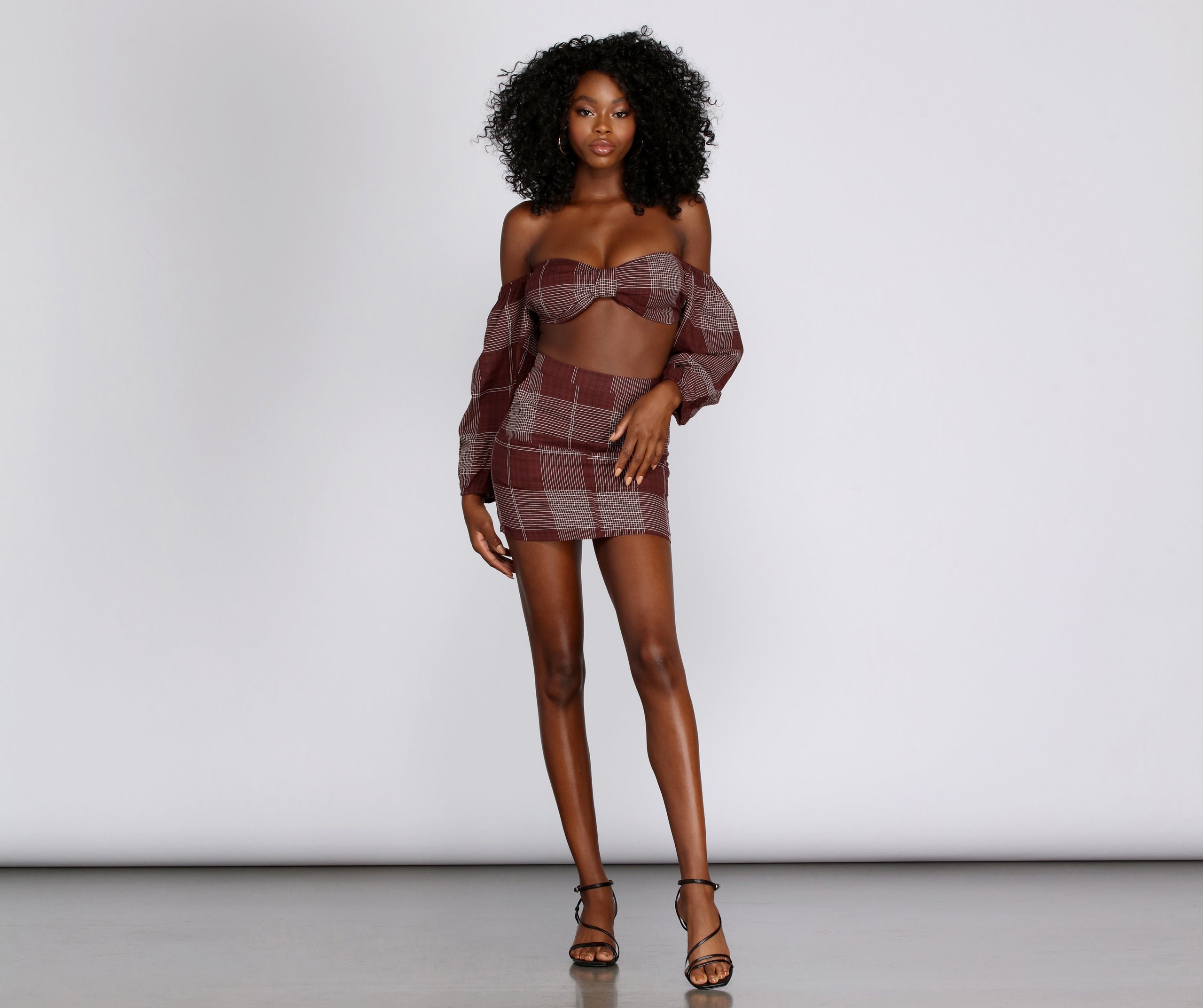 Adorable crop top that will make you an instant trendsetter? Check! This top features an off the shoulder neckline, balloon sleeves with elastic cuffs, a knot front detail, and a majorly cropped elastic banded hem. Garment is composed of a lighweight woven fabric with an all over plaid pattern. Complete your look with the matching mini skirt!
