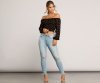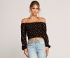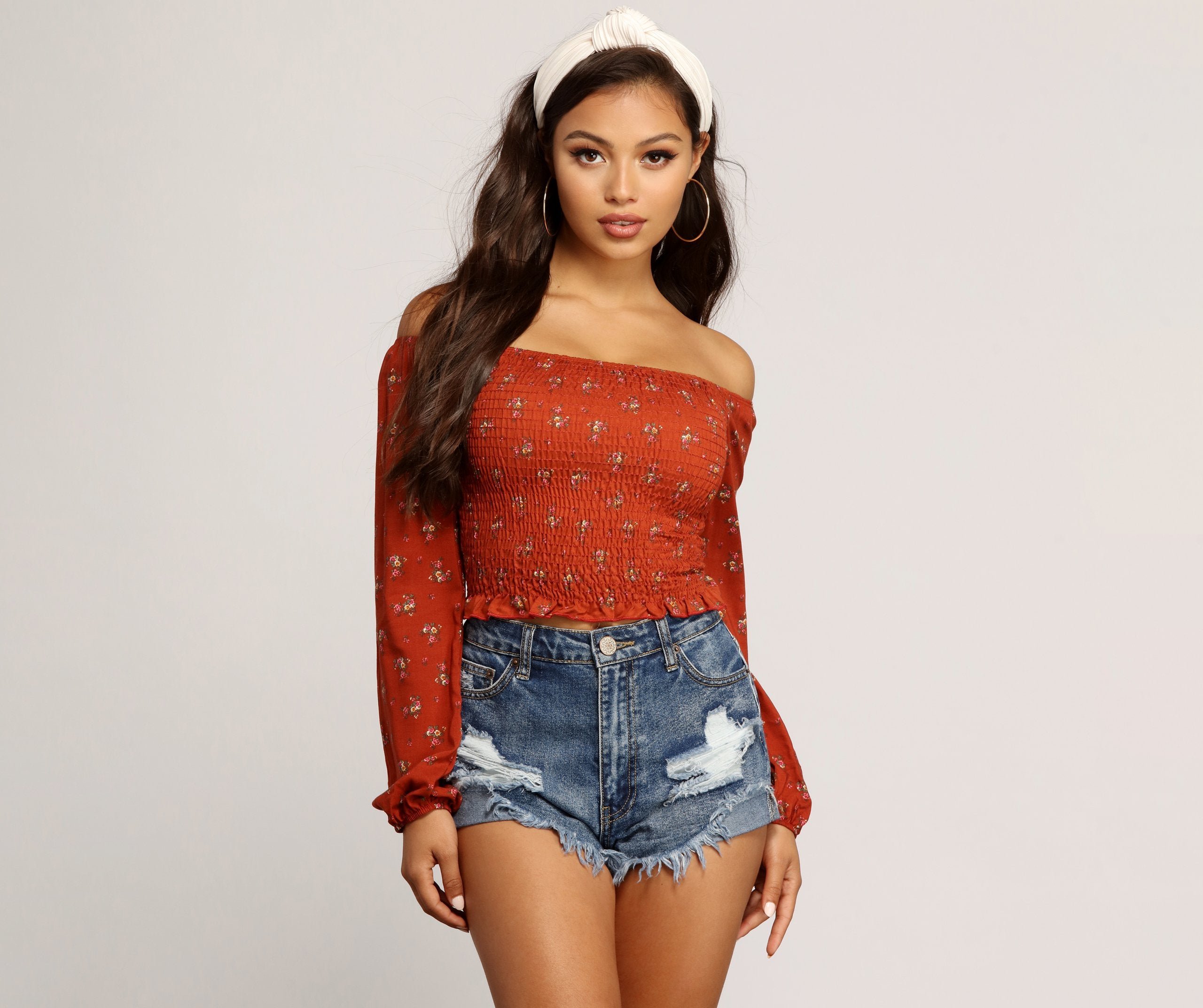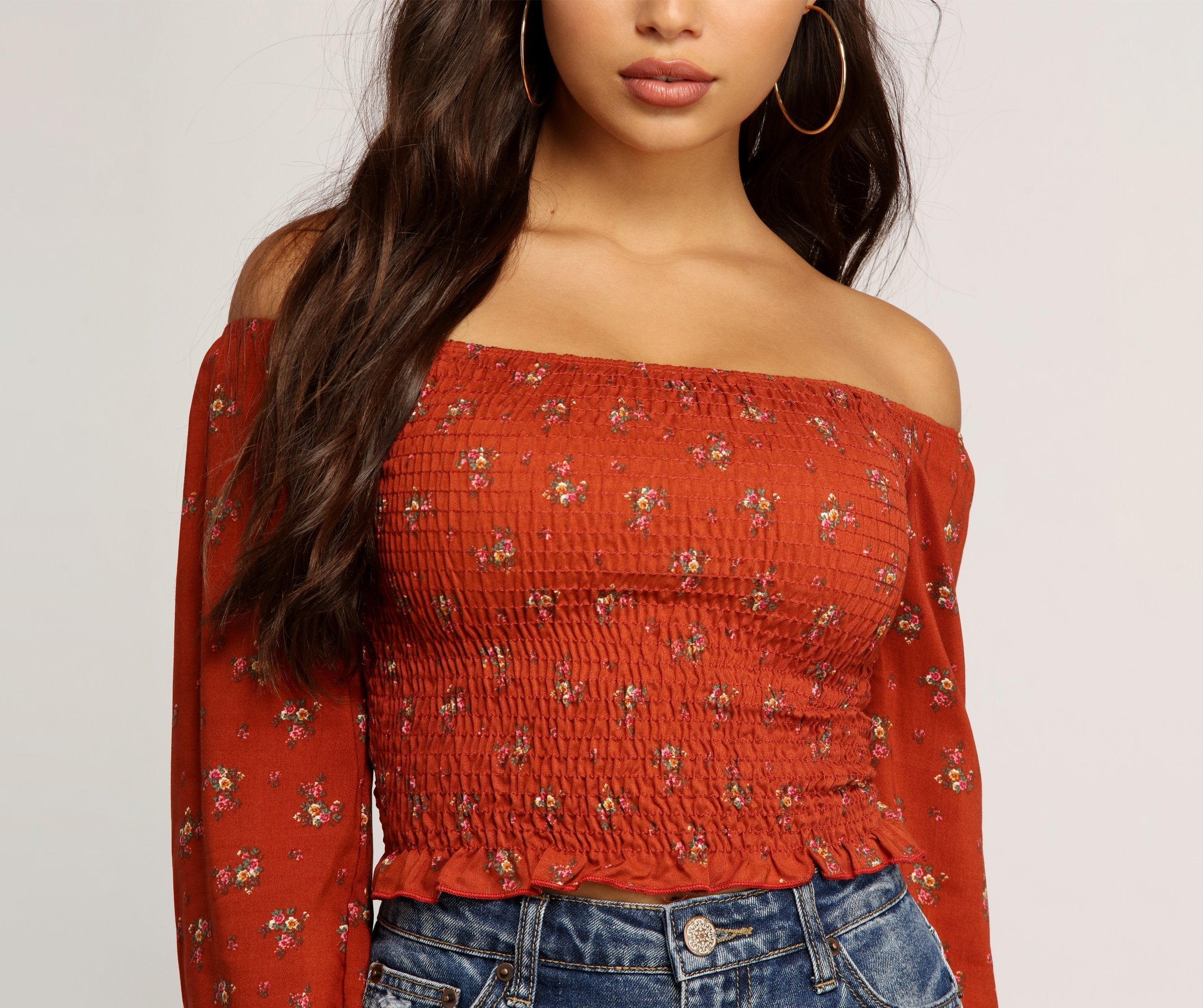Hey babe! Create such a cute look with this adorable ditsy floral smocked top! It features an off the shoulder square neckline, long sleeves with elastic cuffs, a stretchy and smocked bodice, and a cropped hem. The top is composed of a lightweight woven fabric.
