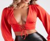 Keep it fierce and flawless?in this?sultry lace-up crop top. It features a plunging neckline leading to a lattice front design, long bishop sleeves with tapered hems, ruching at the waist, and a fitted cropped hem. Pair this bold top with