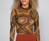 Level up your look with this glam printed mesh crop top! It features a trendy mock neckline, long sleeves, a cropped, form-hugging fit, and a bold all-over medallion print. Style this top with a curve-hugging