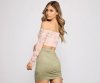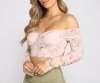Showcase your passion for florals in this crop top that brings the charm. The crop top features an off-the-shoulder neckline, a bustier-like ruched bodice, padded cups, long sleeves, contrast piping, and a cropped hem. The top is composed of a lined mesh fabric that offers a form-hugging fit with a moderate stretch. Complete look with high waist jeans and