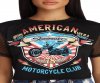 Ride out the season in this cute americana tee! The shirt features a crew neck paired with fishnet sleeves and a cropped hem. The graphic tee is composed of a basic knit that offers a moderate stretch and features a large american screen print with various elements including an american flag print and a classic, motorcycle.