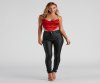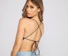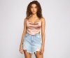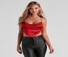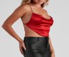 Start off your trendy 'fit in this sultry satin strappy crop top! It features a flattering cowl neckline and an open strappy back with tie closure. Complete the look with