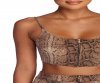 Set up your look in sassy snake print! This crop top features a scoop neckline, narrow shoulder straps, a cropped hem and an exposed zipper. The all over snake print features taupe and brown hues. Top is composed of a smooth knit fabric that offers a relaxed fit with a moderate stretch. Be sure to pick up the matching skirt to complete your look!?